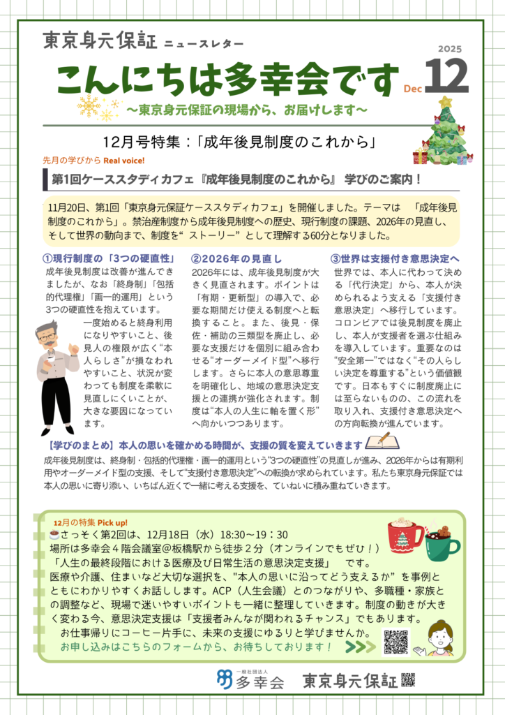 東京身元保証としても、こうした関心の高いテーマを踏まえながら、 現場の「知りたい」「話したい」に寄りそった場づくりを続けていきたいと考えています。